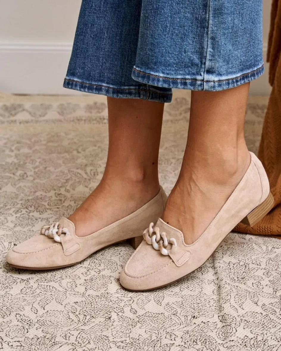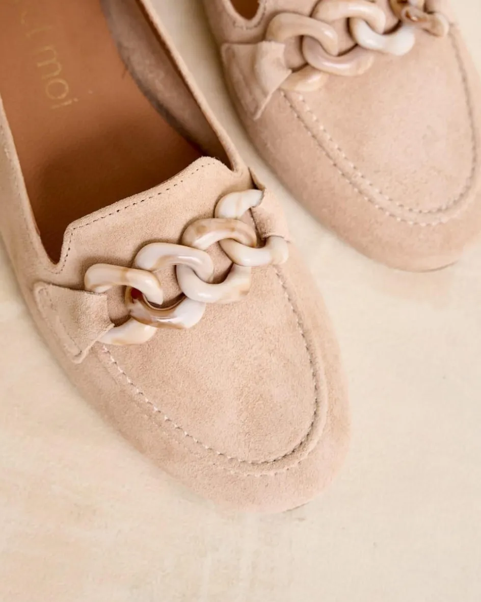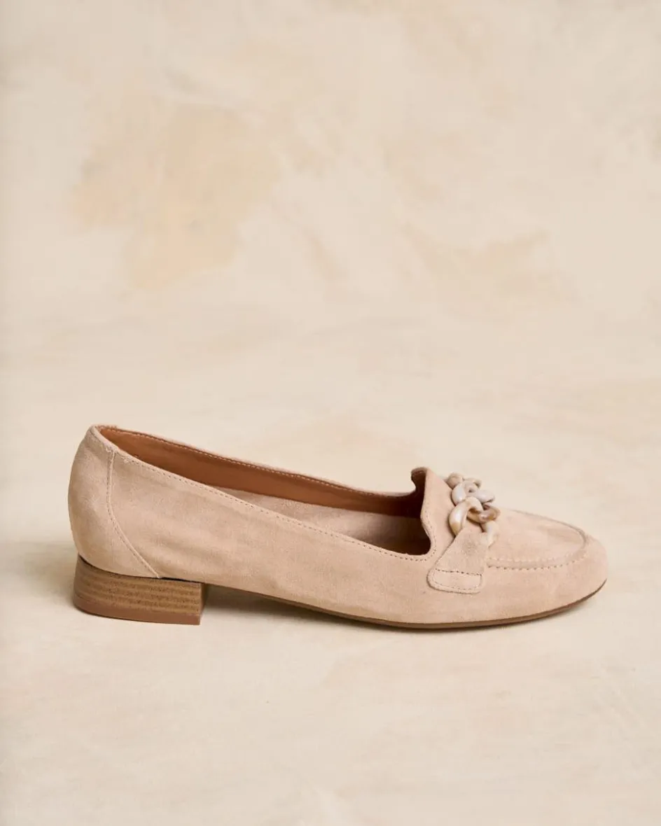 Mocasín plano de ante en color maquillaje. Un modelo elegante de un exterior confeccionado en ante con cadena combinada a tono con el tejido. Un diseño de extrema ligereza y confort; resistente, atemporal y muy versátil.