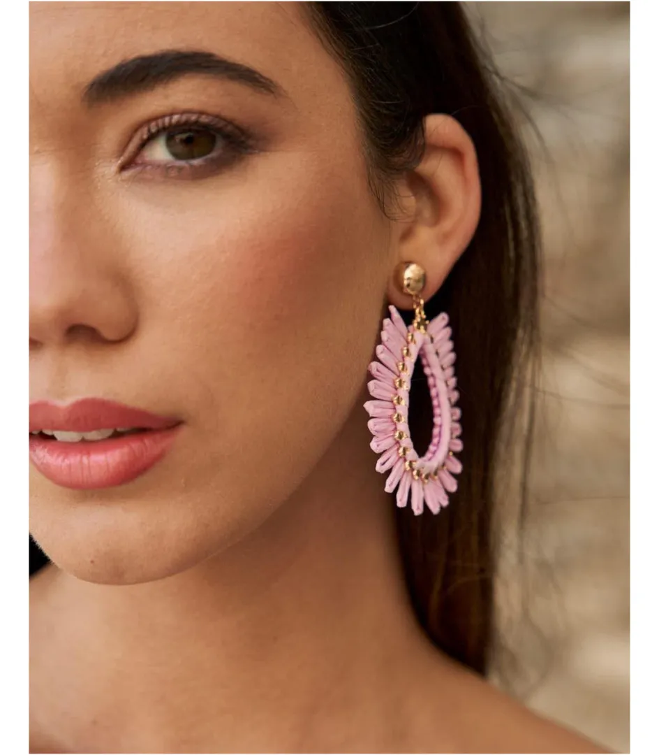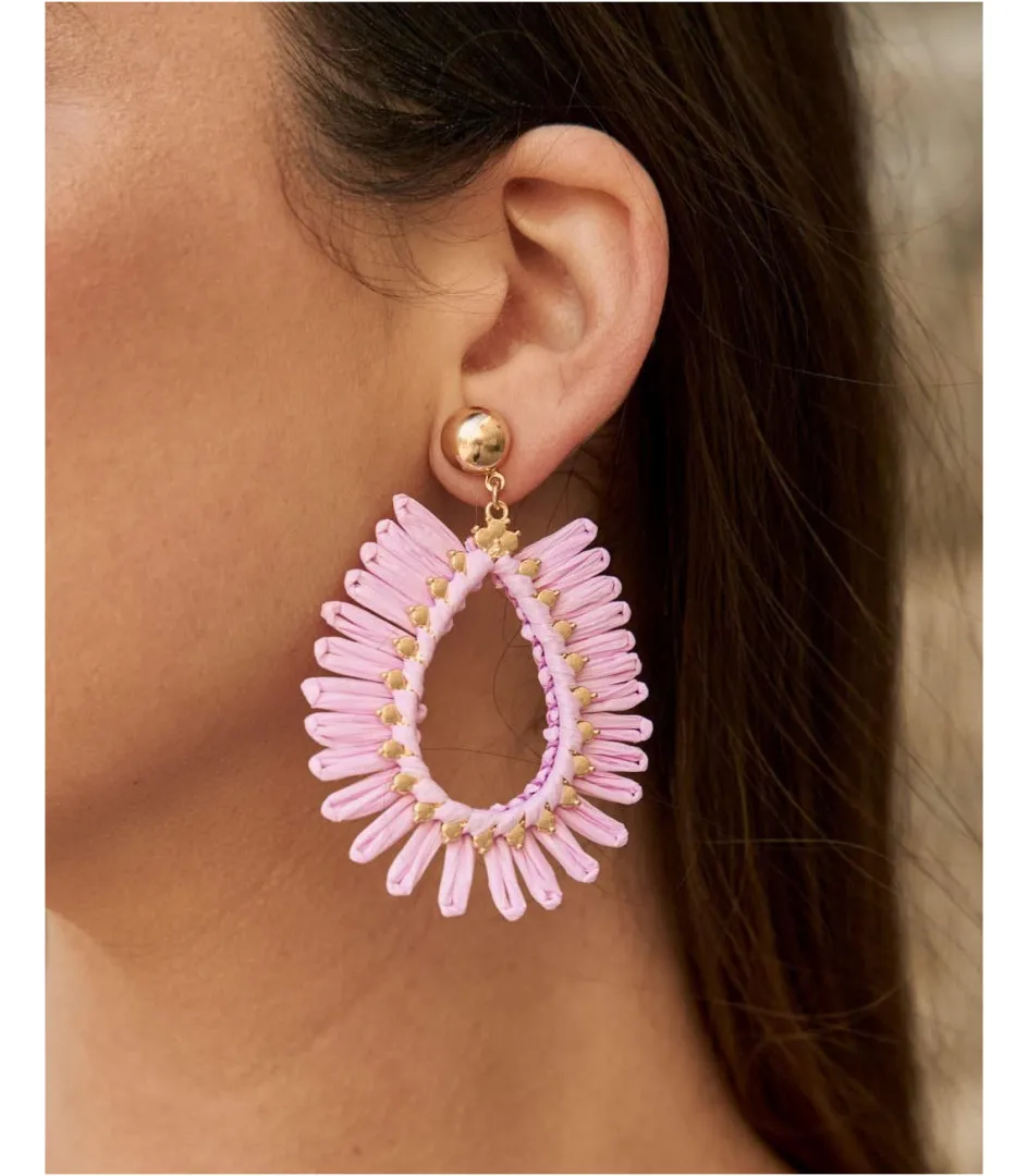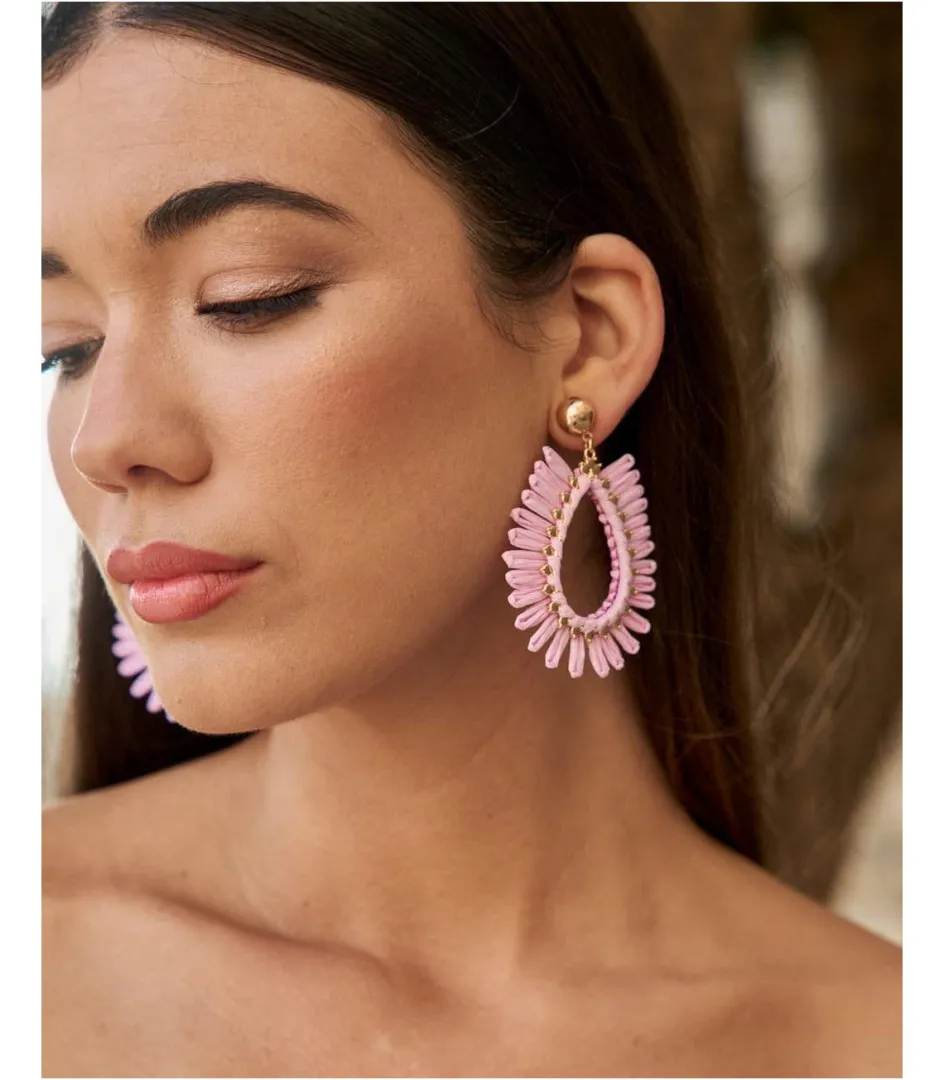 Pendientes largos de rafia en forma de gota en color lila. Pendientes muy ligeros. Cierre mediante tuerca. Un pendiente ideal para darle un toque original y divertido al look.