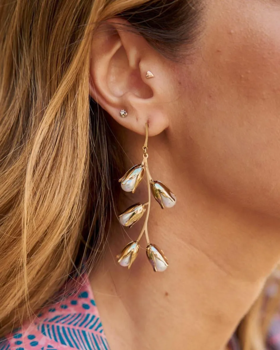 Pendientes largos efecto rama con perlas que sobre salen como flores. Pendientes con diseño alargado y muy ligeros. Cierre mediante tuerca. Un pendiente ideal para darle un toque diferente a tu look.