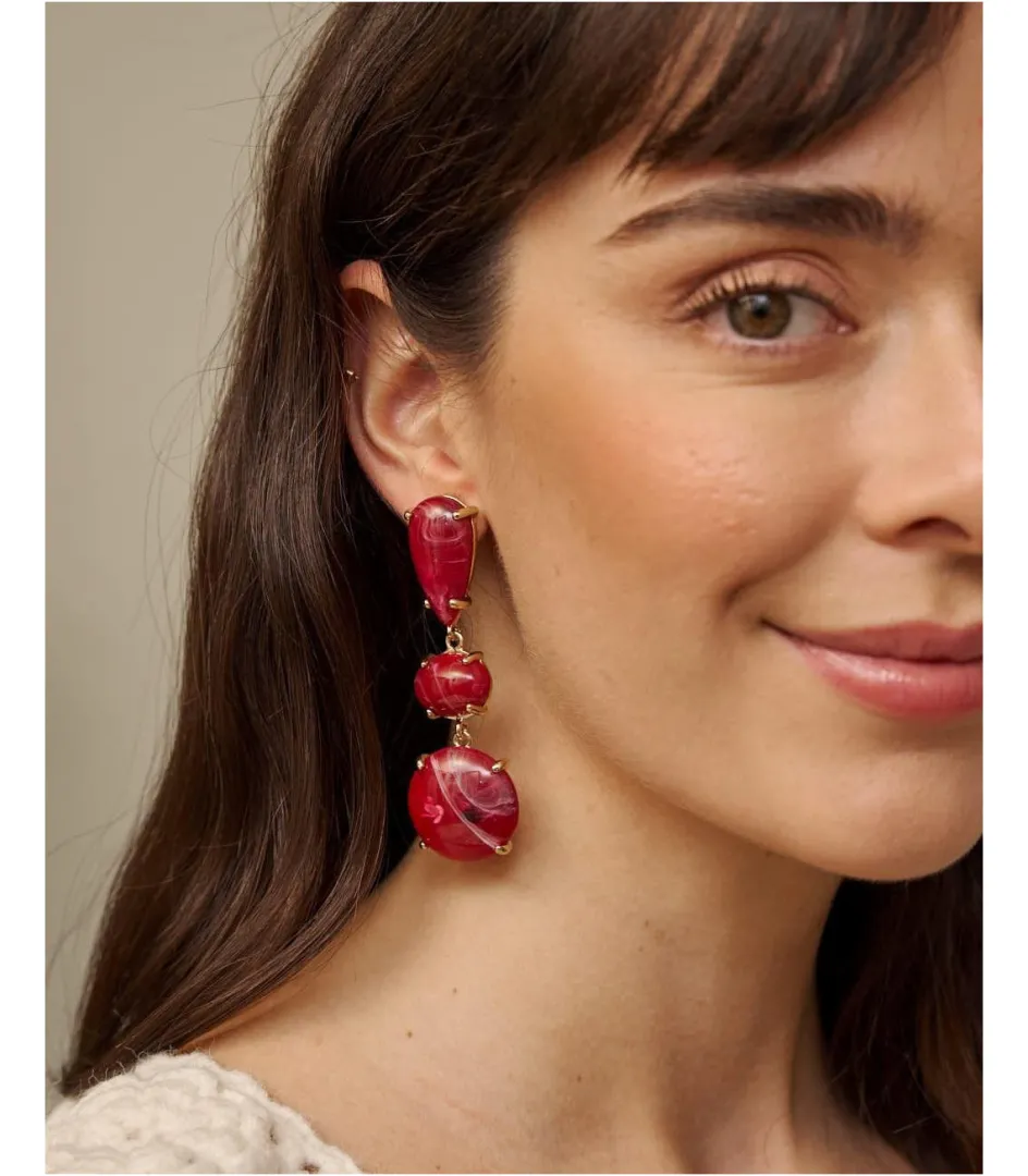 Pendientes en color cereza. Lágrima al tono del que cuelga una bola de la que desciende otra bola de mayor tamaño con el mismo color. Un pendiente con movimiento. Cierre de tuerca. Ideal para darle un toque muy femenino a tu look.