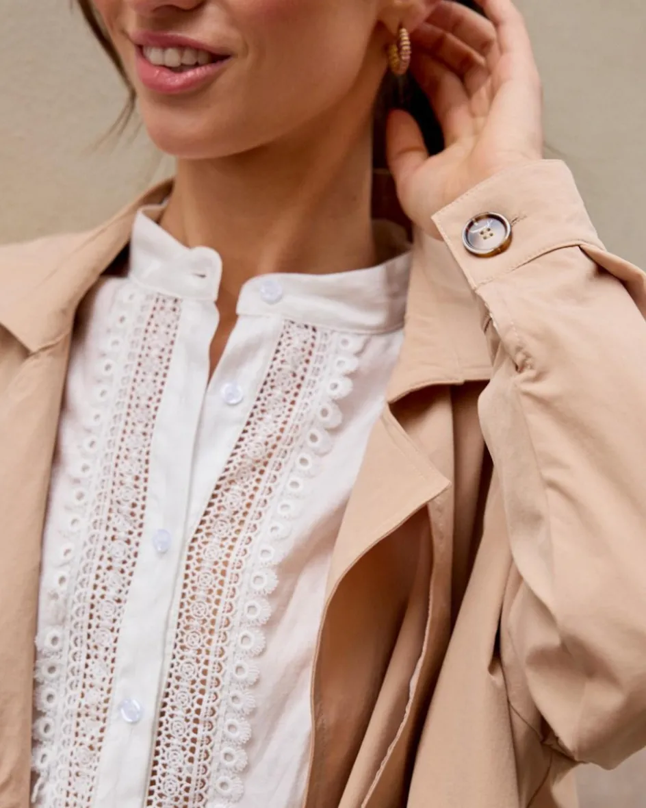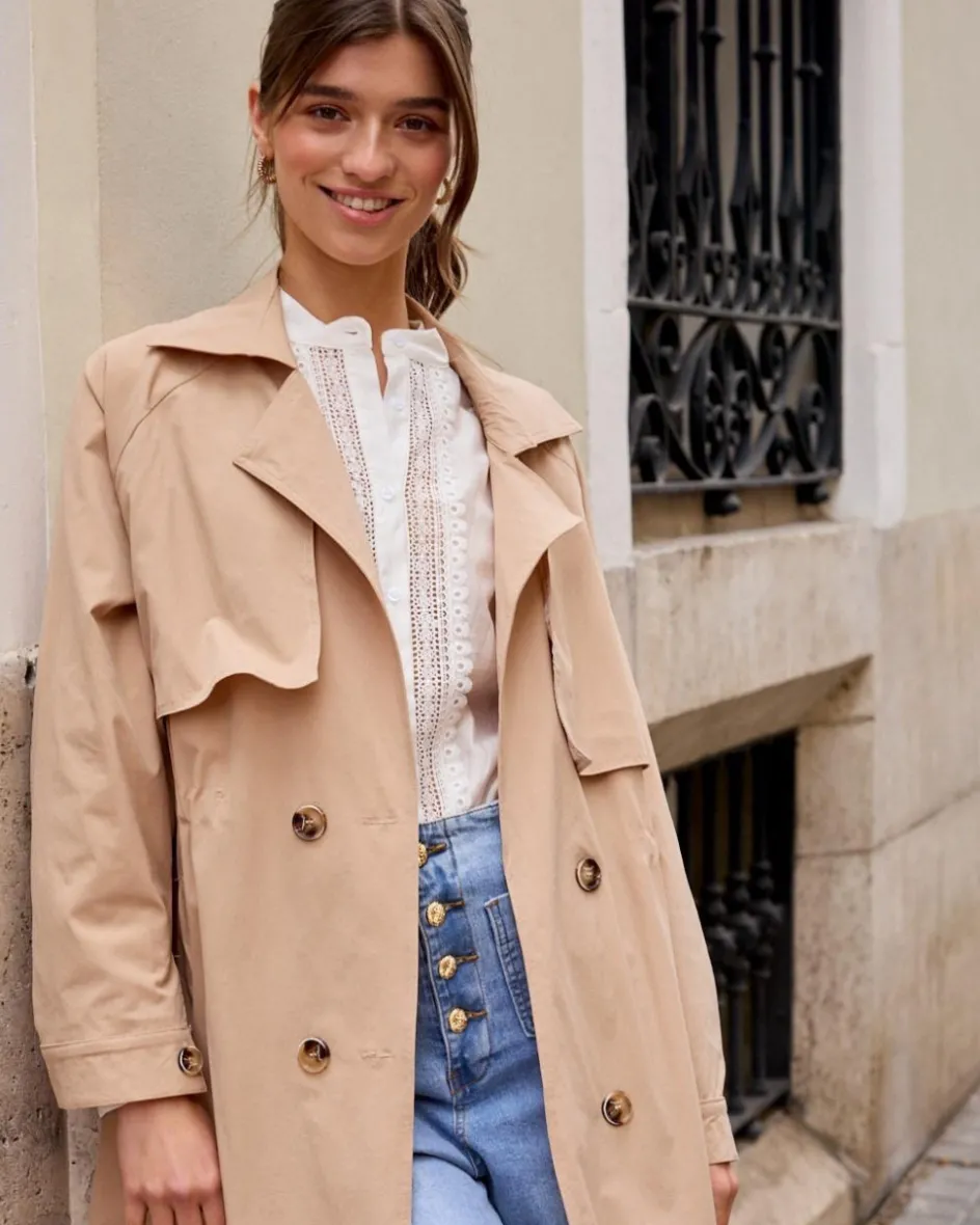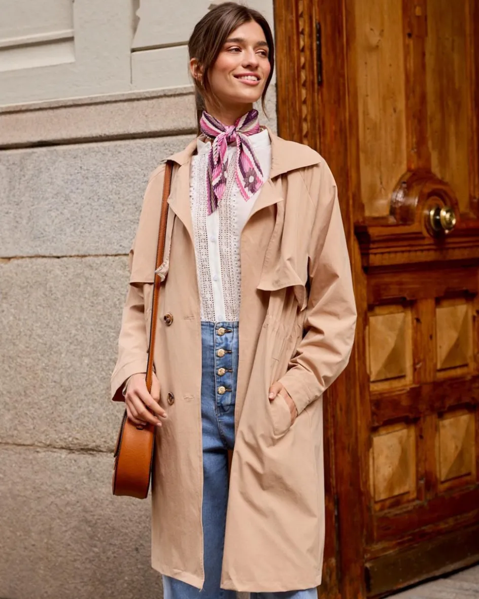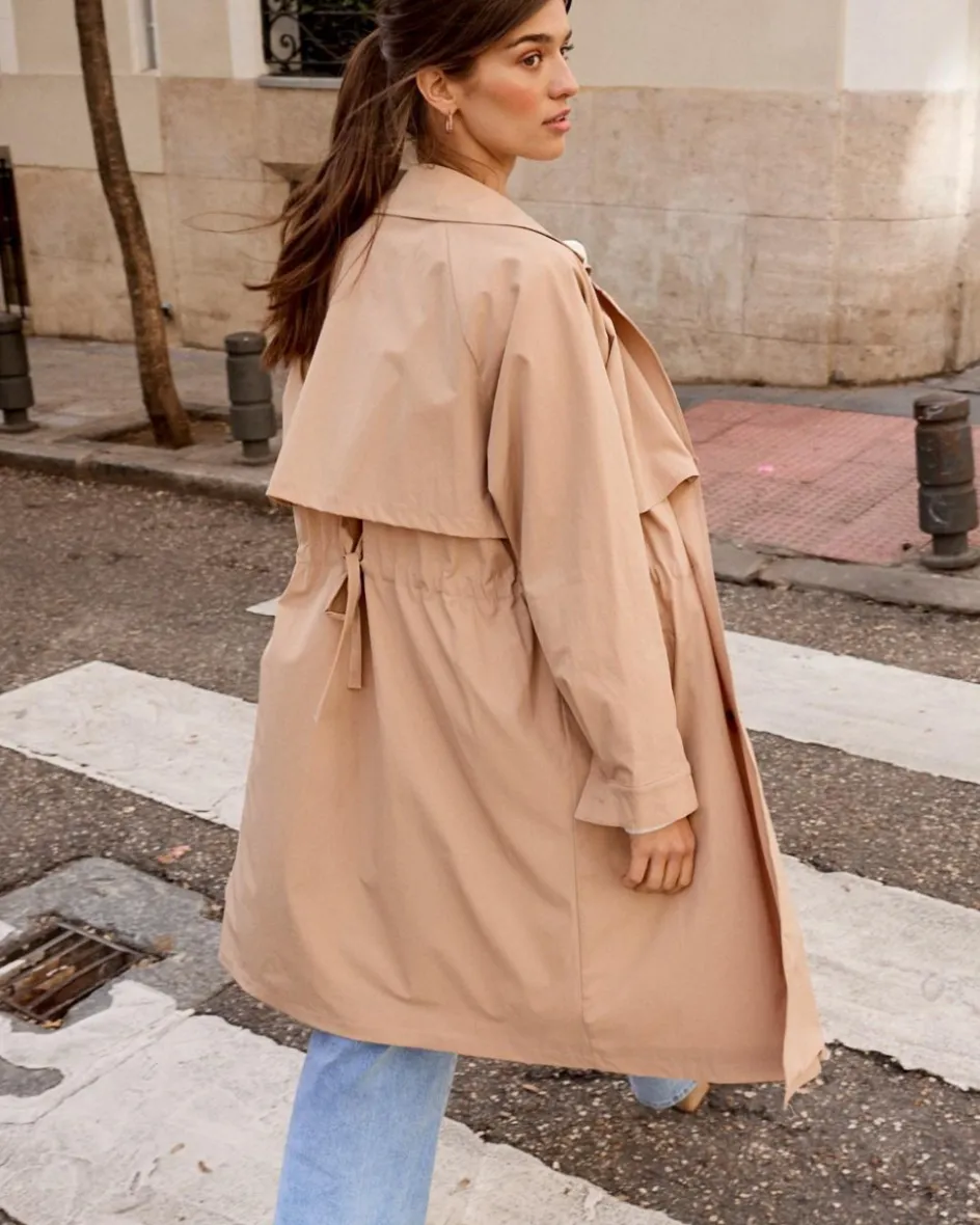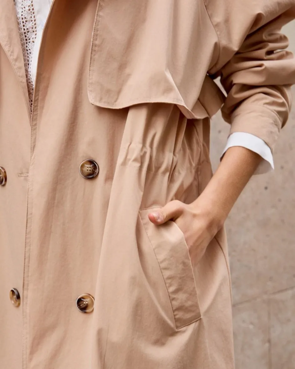 Gabardina midi, en un tono champán. Cuello con solapas. Manga larga y en el puño tiene una apertura con un botón, que se puede cerrar o dejar abierto. Diseño recto. Detalle de bolsillos en ambos lados.