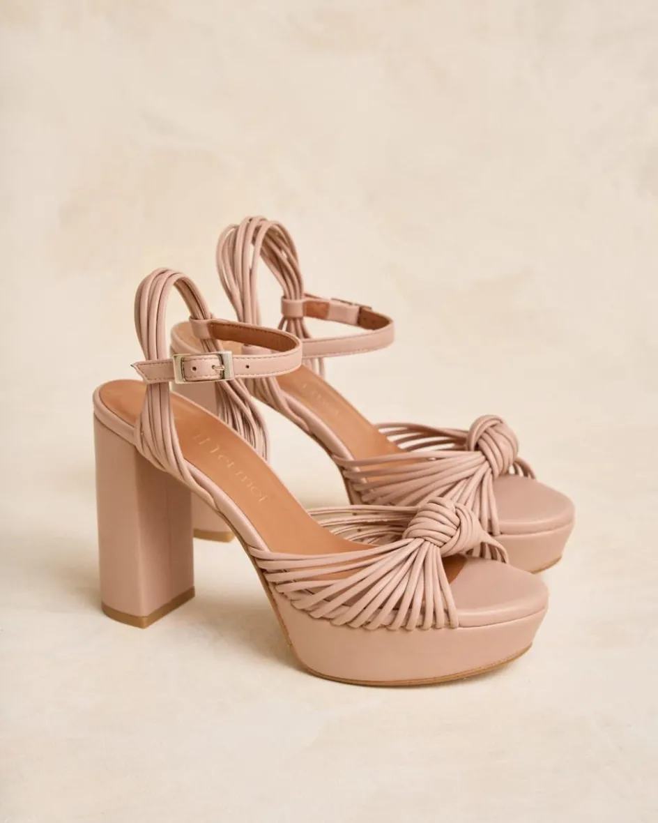 Sandalia de tacón destalonada en tono nude con múltiples cintas que se cruzan entre sí, con detalle de nudo en el centro. Punta redondeada y escote de corazón. Cierre al tobillo mediante correa regulable con hebilla cuadrada. Tacón ancho para mayor comodidad. Un zapato muy femenino y elegante para los eventos de esta temporada.