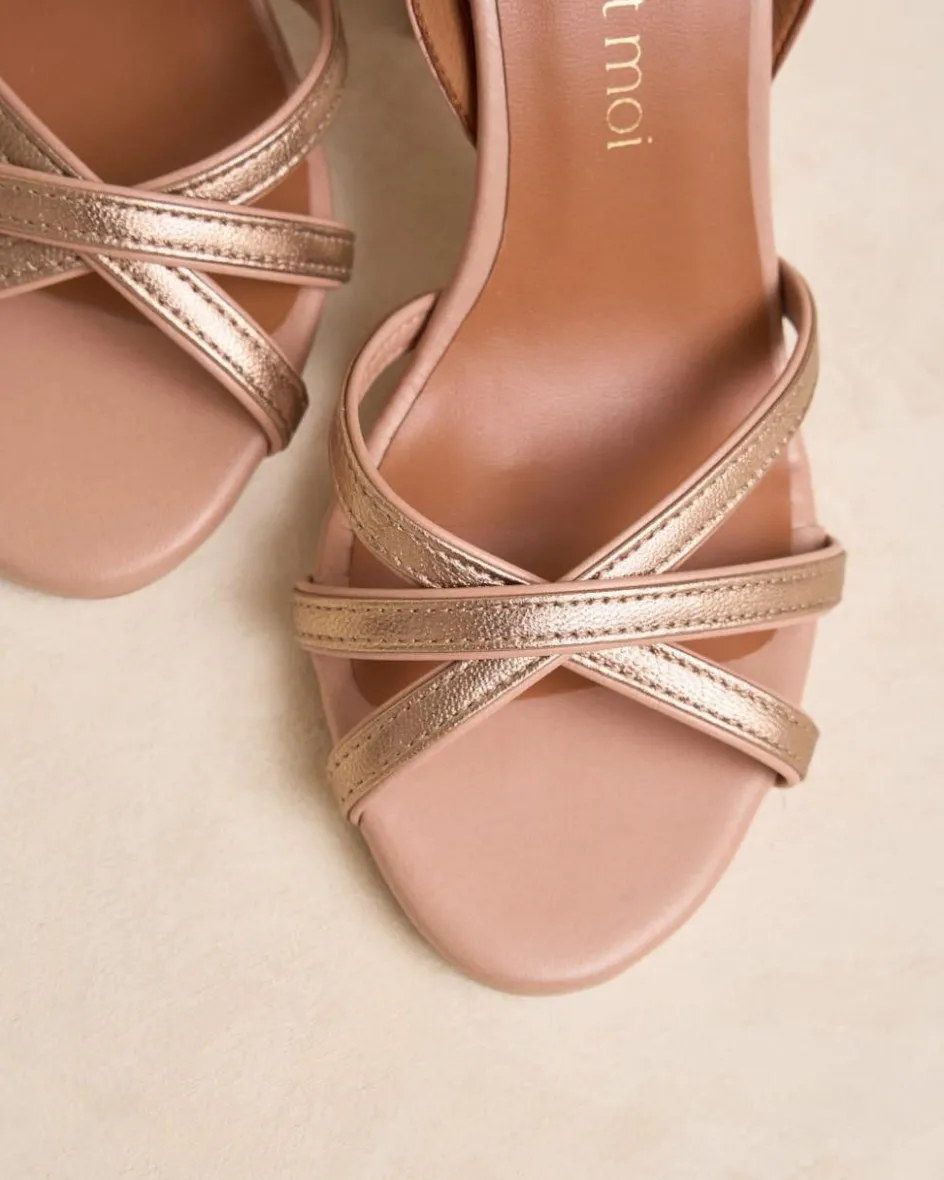 Sandalia de tacón destalonada en color nude con varias cintas que se cruzan entre sí en un tono metalizado. Punta redondeada. Cierre al tobillo mediante correa regulable con hebilla cuadrada. Tacón ancho para mayor comodidad. Un zapato muy femenino y elegante para los eventos de esta temporada.