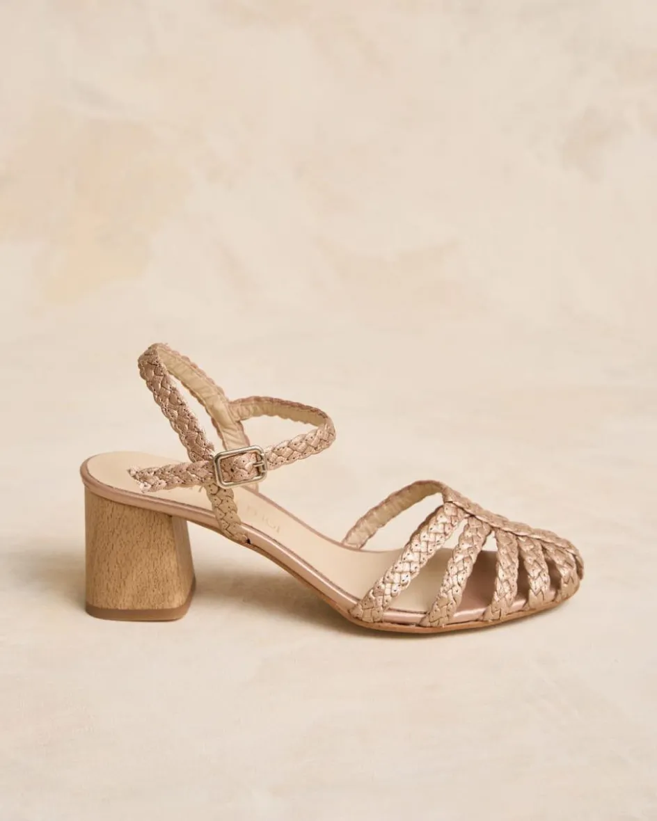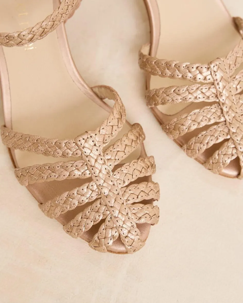 Sandalia trenzada de piel en color oro con tacón cuadrado. Puntera ligeramente redondeada con detalle de cintas trenzadas cruzadas sobre el empeine. Talón sujeto con cinta de piel. Tobillo con cita con hebilla para un mejor ajuste. Tacón cuadrado de madera. Una sandalia muy especial y estilosa para esta temporada.
