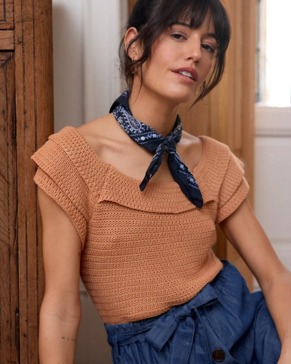 Top de punto con escote barco, con volante en el cuello. Manga corta con volantes. Top perfecto para dar un toque diferente a los looks del día a día.
