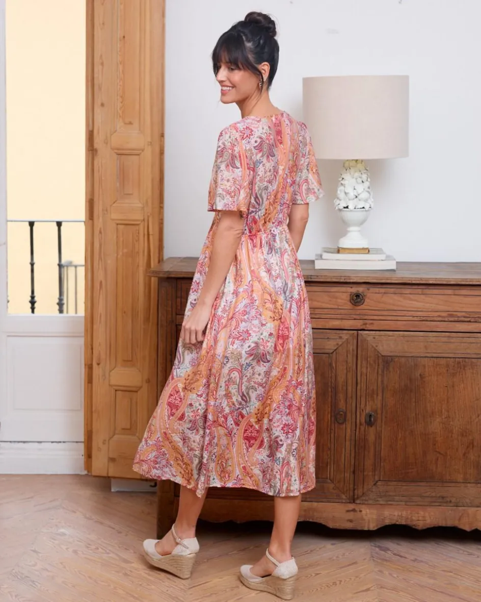 Vestido largo con estampado floral sobre un fondo en tono melocotón. Vestido con escote en pico y corte con drapeado bajo el pecho. Modelo con manga corta fluida. Falda larga fluida. Vestido ideal para la lactancia y primeros meses de embarazo. Ver másVer menos Referencia 180127 COMPOSICIÓN Y MEDIDAS:70% Viscosa, 30% PoliamidaBego mide 1,80 cm y lleva la talla S. Si dudas con la talla te recomendamos usar el recomendador online.CUIDADOS:Lavar a mano máximo 30º Ficha técnica Colores NARANJAS Etiquetas: SEA 14R509 – ENVÍOS, CAMBIOS Y DEVOLUCIONES Favorito57 ENVÍOS:Todos los envíos cuentan con gastos de envío, que dependen de la dirección de entrega.• Península y Portugal: 3,50€ | 2-4 días laborables.• Baleares: 6,50€ | Hasta 7 días laborables.• Países de la Unión Europea: 10,95€ | Hasta 10 días laborables.• Envíos a Europa (No UE): 15,95€ | Hasta 10 días laborables.• Resto del mundo*: Aprox 10€ | Hasta 15 días laborables.*NO hacemos envíos a Canarias, Ceuta, Melilla, Afganistán, Bielorusia, Congo, Bali, Myanmar, Nigeria, Rusia, Senegal, Somalia y Ucrania.¡Importante! En periodo de rebajas, los pedidos pueden tardar un poco más de lo habitual ¡Rogamos paciencia!CAMBIOS: ¡El envío con el cambio solicitado es gratuito!Pedidos realizados desde España:Plazo de 14 días laborables desde que recibes el paquete en casa.Pedidos realizados desde fuera de España:Plazo de 20 días naturales desde que realizamos el envío.*La gestión del envío del paquete de vuelta a nuestro almacén corre a cuenta del cliente, haciéndose cargo de los costes de este envío, mediante el courier de su elección o con nuestro servicio de DHL.En el primer trámite de cambio, el envío de vuelta es gratuito (tanto de talla como de producto). Permitimos DOS trámites de cambio, en caso de querer tramitar un segundo cambio, se descontarán los gastos de envío según destino.Una vez recibido el paquete en nuestro almacén, tramitaremos tu cambio en un plazo máximo de hasta 10 días laborables. Recibirás un correo de confirmación cuando este pedido de cambio esté listo para ser enviado.