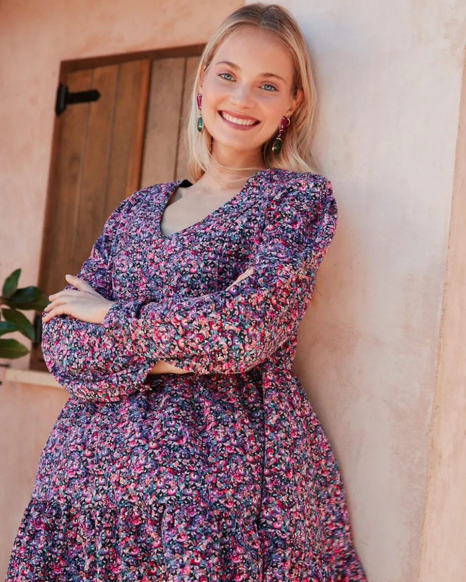 Vestido con corte babydoll corto con estampado floral en color morado. Cuello camisa. Modelo de manga larga terminado en puño. Dispone de forro interior. Falda corta y con volumen.