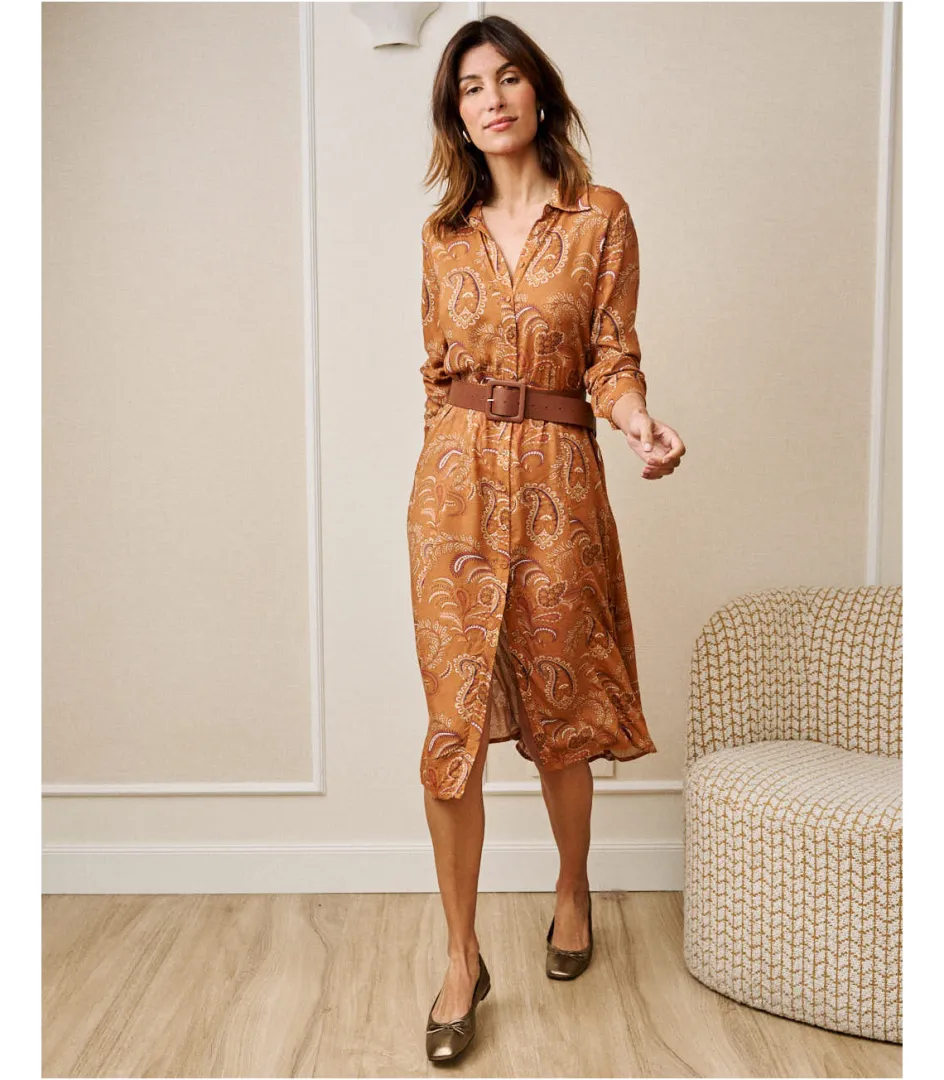 Vestido camisero midi con estampado en color teja. Vestido con cuello camisa. Modelo de manga larga terminada en puño, Vestido ajustado a la cintura mediante un cinturón del mismo tejido. Hilera de botones desde el cuello hasta el bajo. Falda midi con ligero vuelo. Vestido ideal para la lactancia y embarazo. El vestido con el que completar tu armario.Diseñado en España.