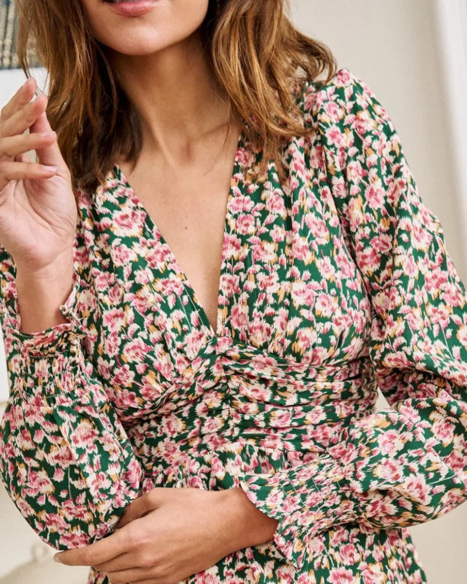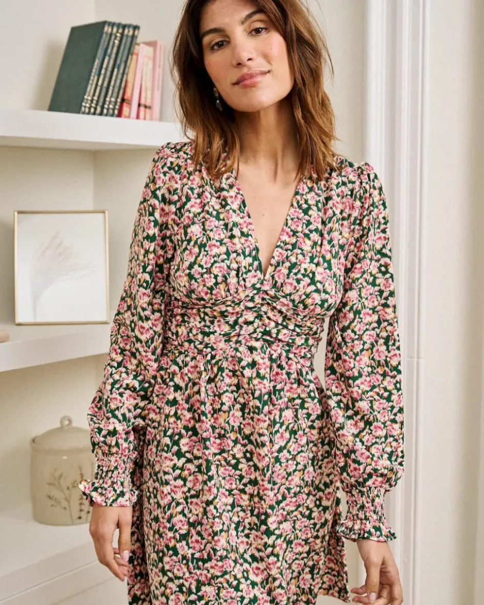 Vestido corto con estampado floral en color verde esmeralda. Escote en pico. Modelo de manga larga terminado en elástico. Corte a la cintura con drapeado. Dispone de forro interior. Falda corta y con ligero vuelo.