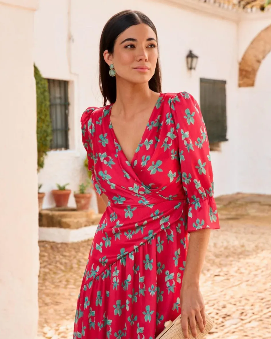 Vestido largo con estampado floral sobre fondo en color cereza. Escote en pico cruzado. Detalle de la cintura irregular, ligeramente más ajustada con goma para una mayor adaptación al cuerpo. Manga media con puño al final. Falda del vestido fluida, con bajo irregular. Un vestido ideal para las invitadas con un toque de color muy especial. Vestido perfecto para la lactancia.