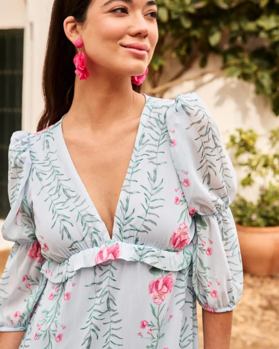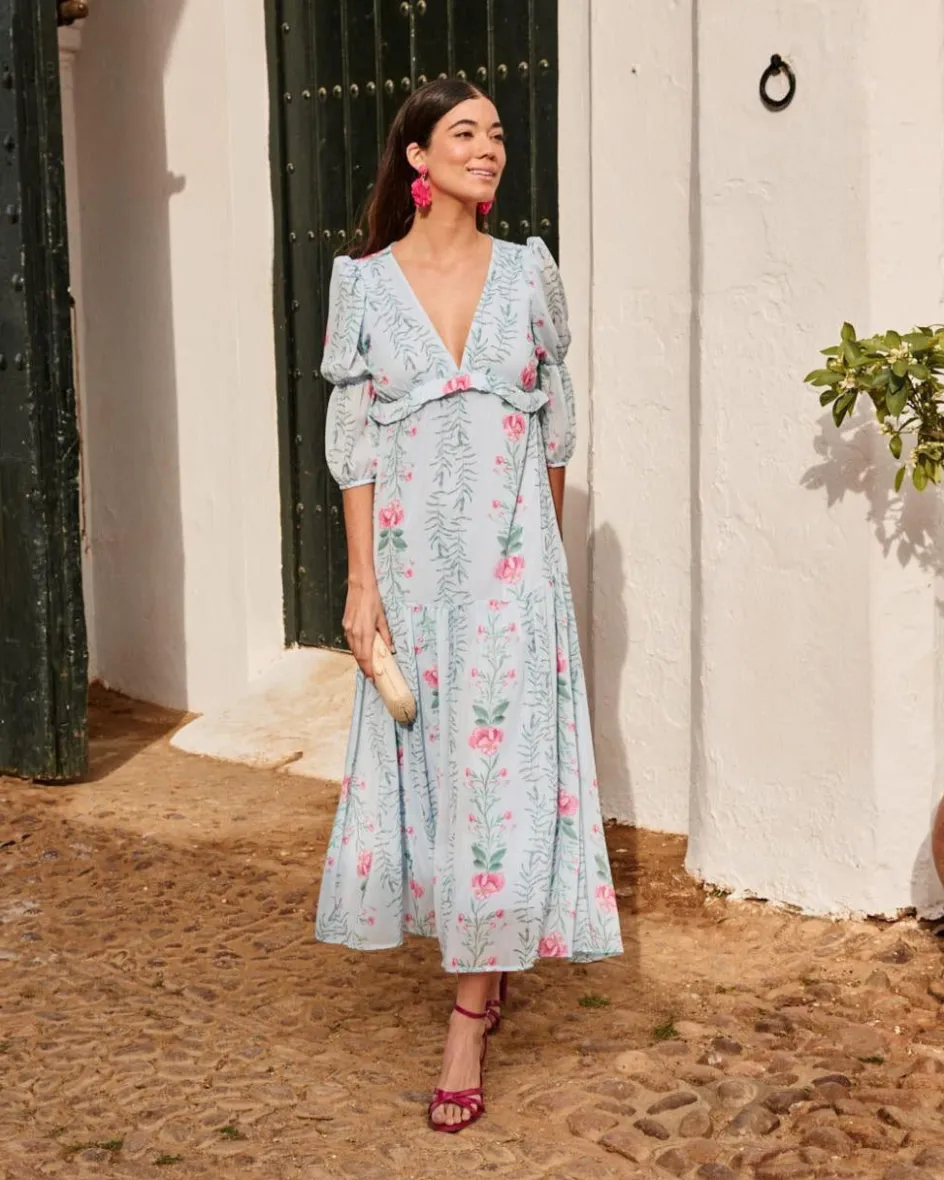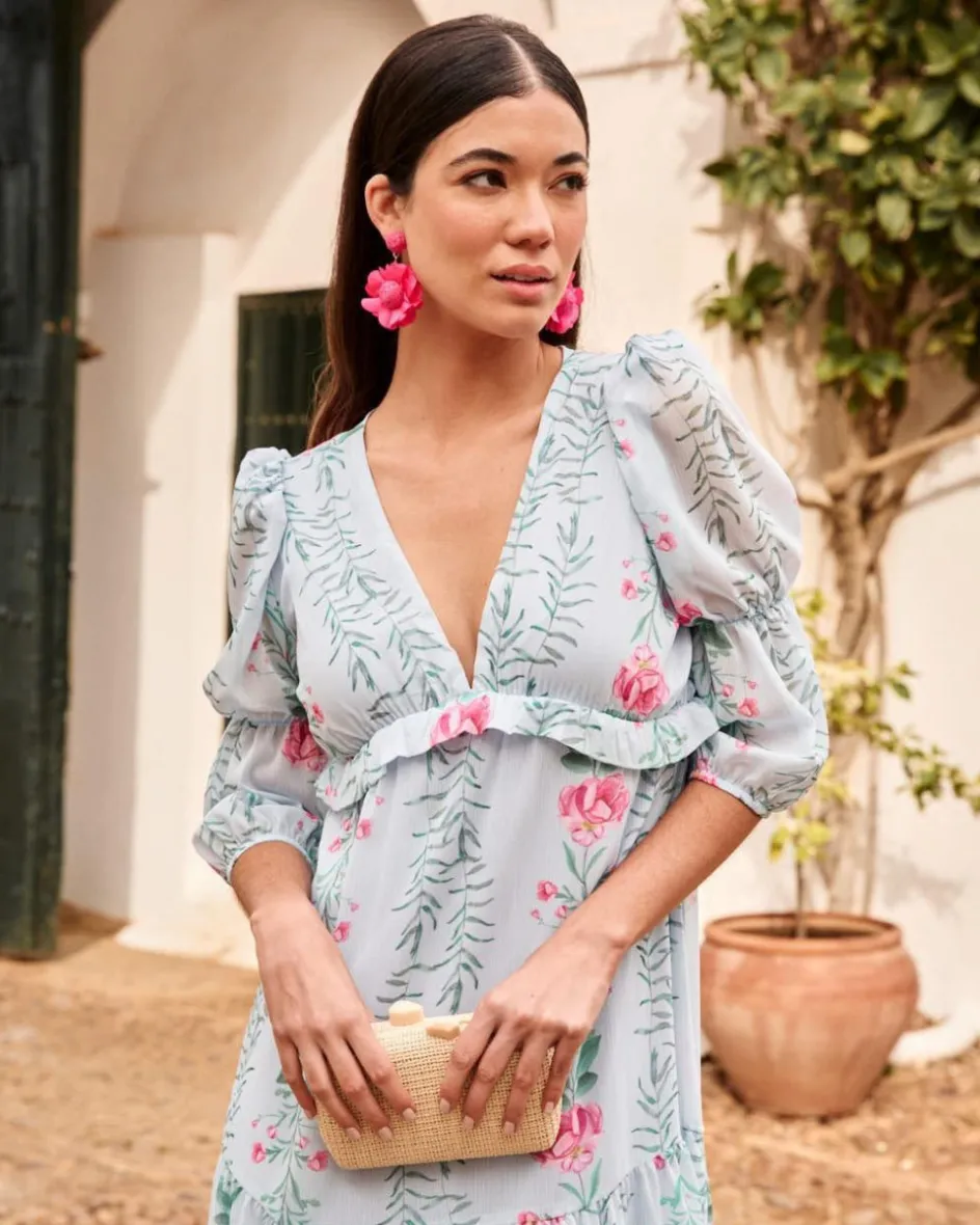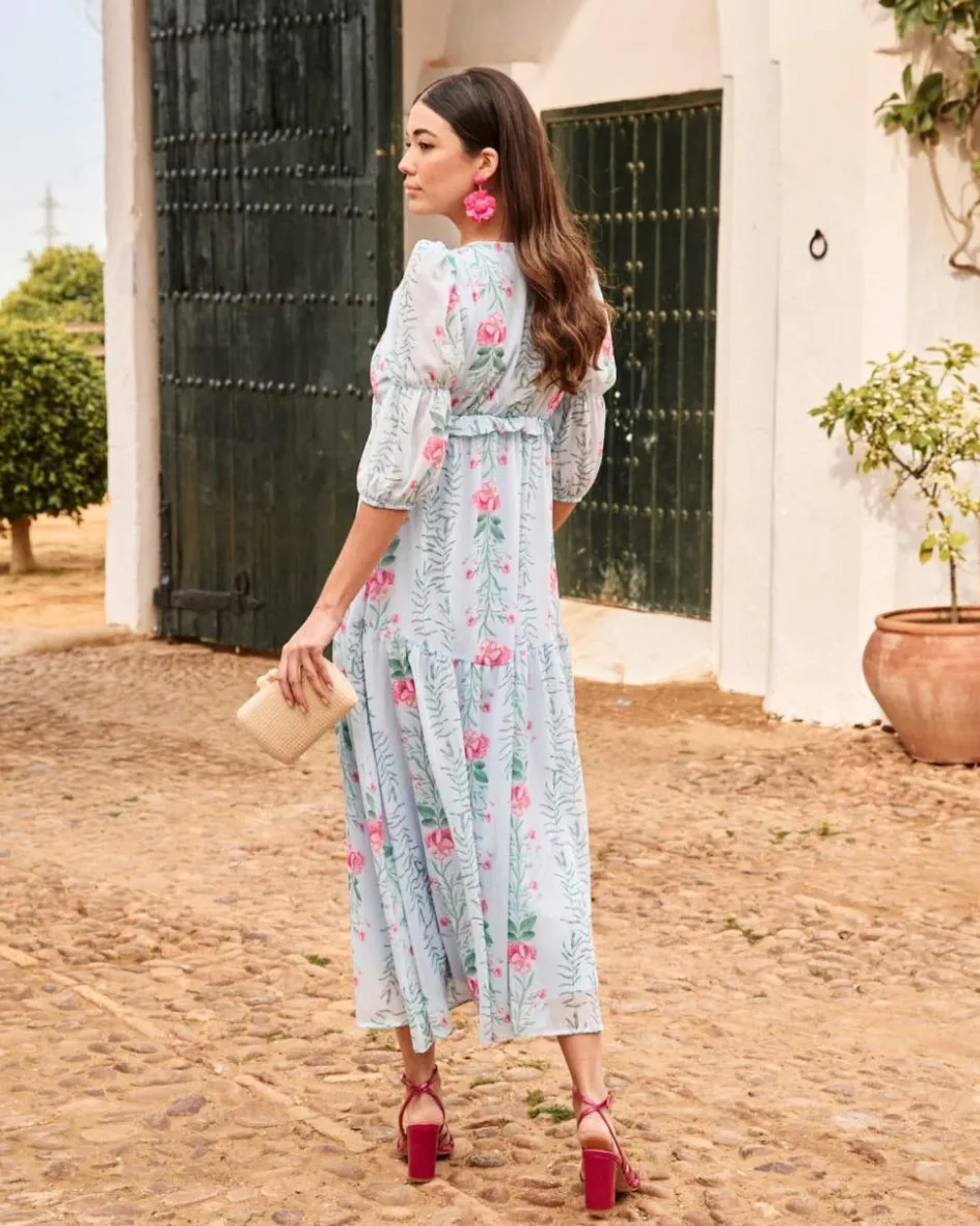Vestido con estampado floral, sobre fondo celeste. Escote en pico, con volante debajo del pecho. Cintura ligeramente más ajustada con goma para una mayor adaptación al cuerpo. Manga 3/4 abullonada. Bajo del vestido fluido. Un vestido ideal para las invitadas con un toque de color muy especial. También perfecto para el embarazo.