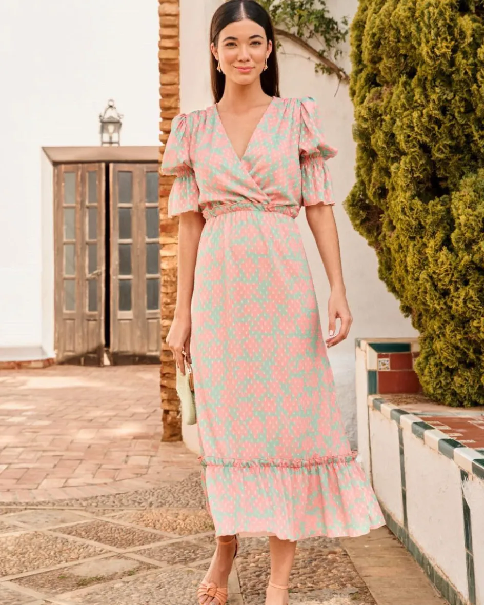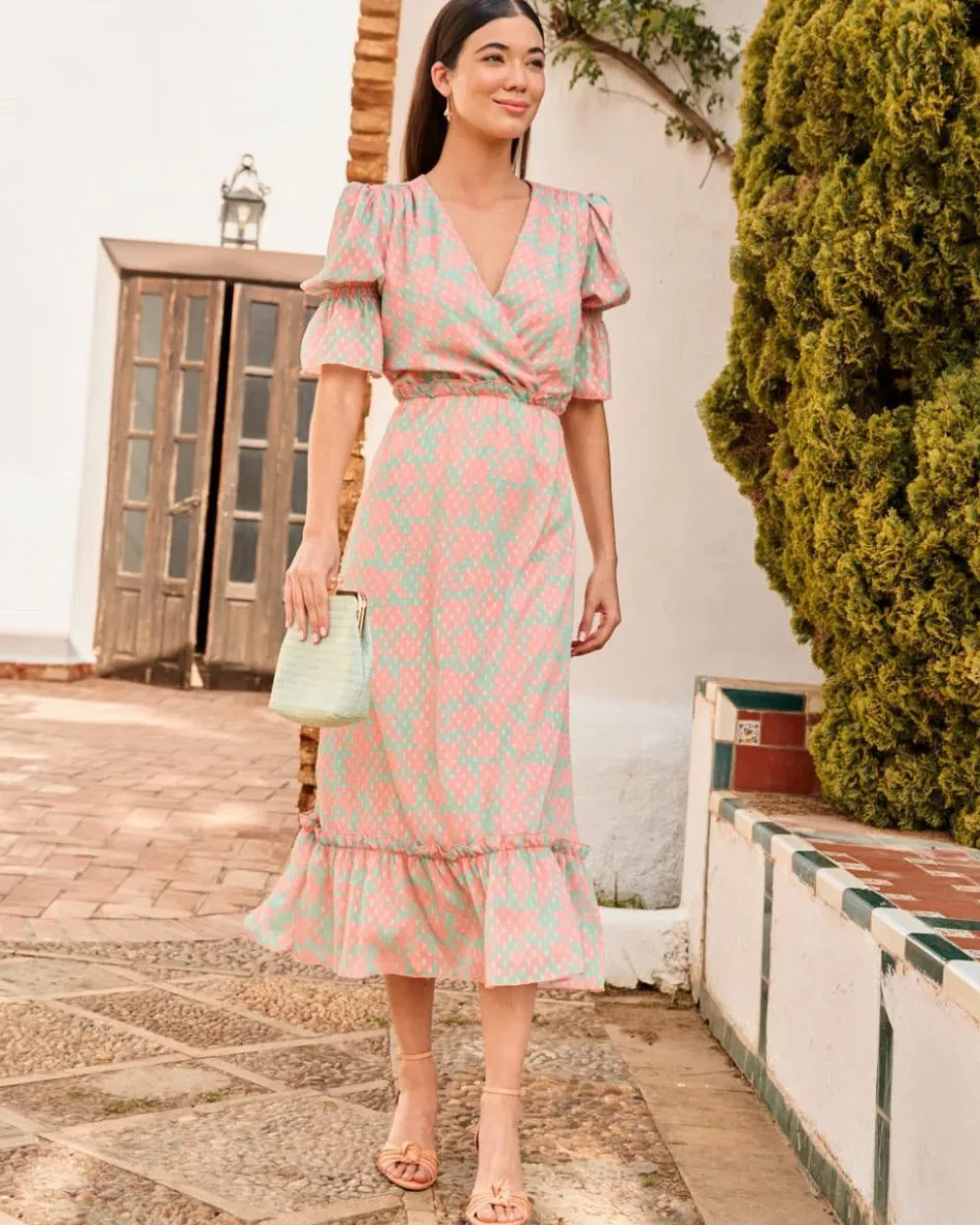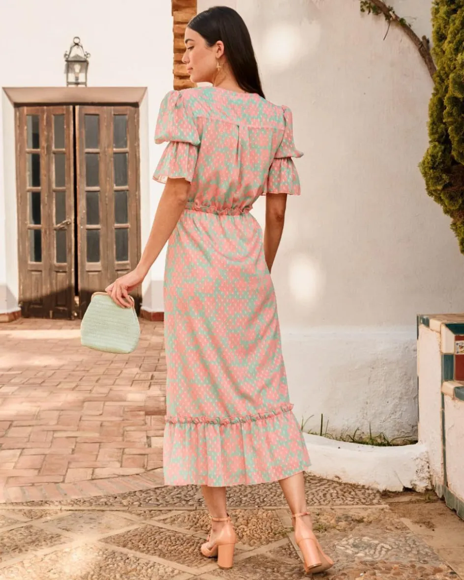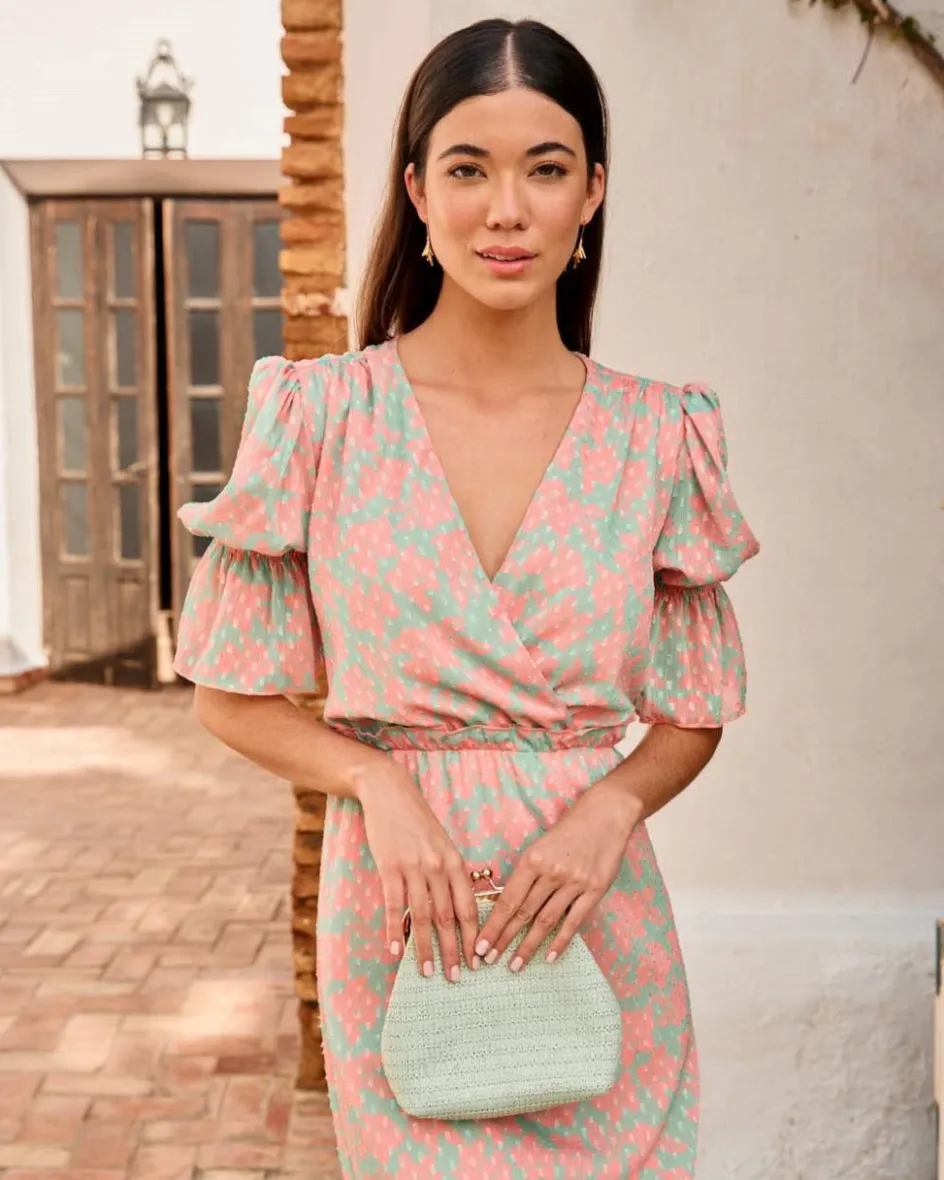 Vestido largo con estampado floral. Escote en pico cruzado. Cintura ligeramente más ajustada con goma para una mayor adaptación al cuerpo, detalle de un pequeño volante. Manga media con goma y volante al final. Falda del vestido fluida, con bajo con volante. Un vestido ideal para las invitadas con un toque de color muy especial y también para la lactancia o el embarazo.