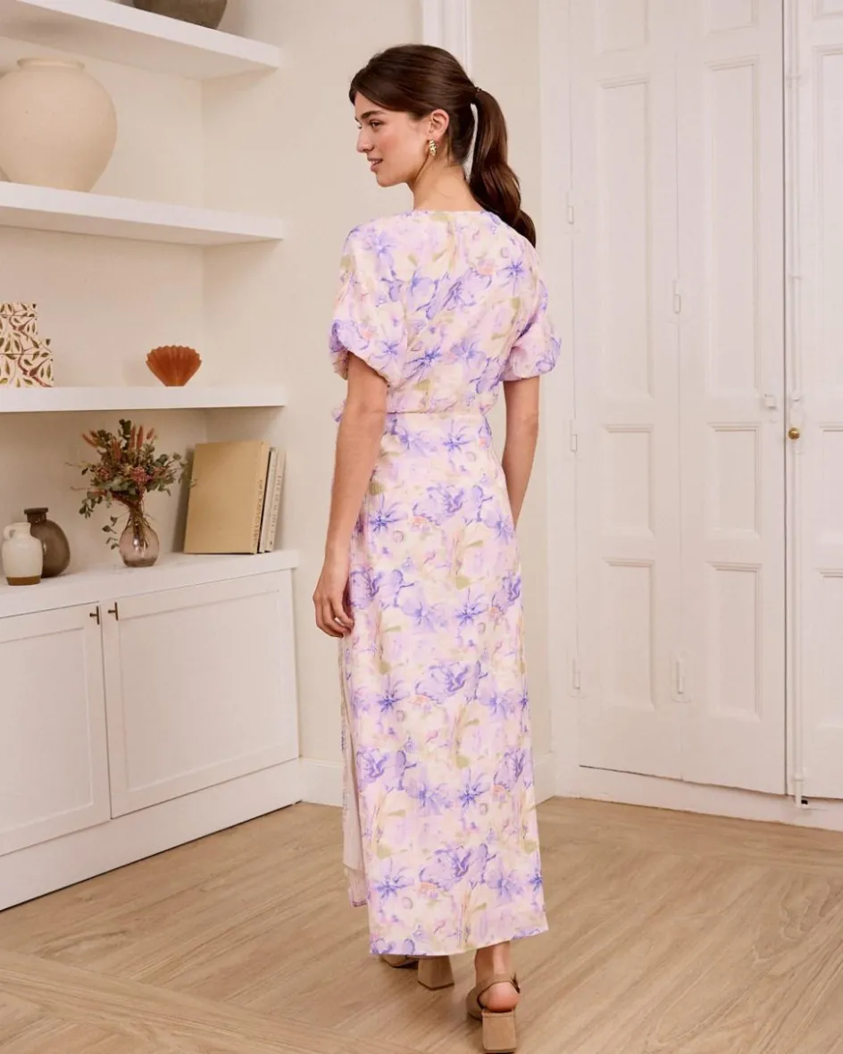 Vestido largo cruzado, que se ata con lazada lateral. Modelo con estampado floral en tonos lila. Vestido con escote en pico. Manga corta abombonada. Falda larga con apertura lateral y ligero vuelo. Vestido ideal para la lactancia y primeros meses de embarazo.