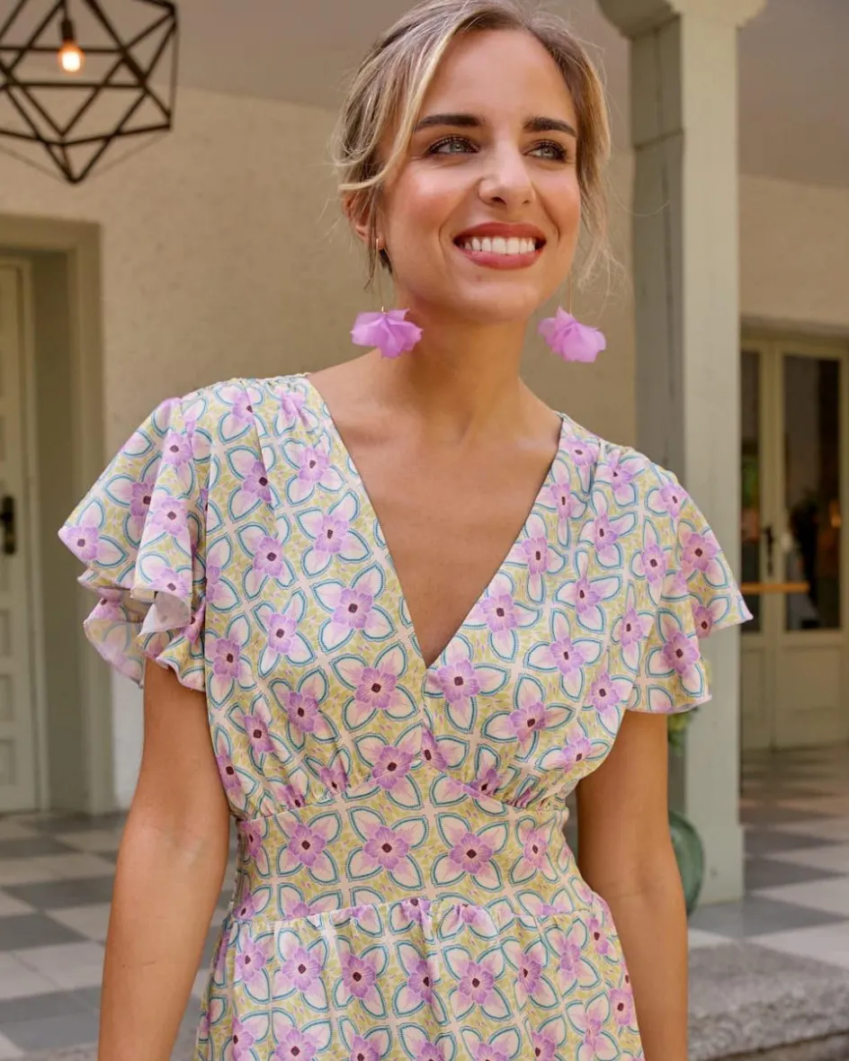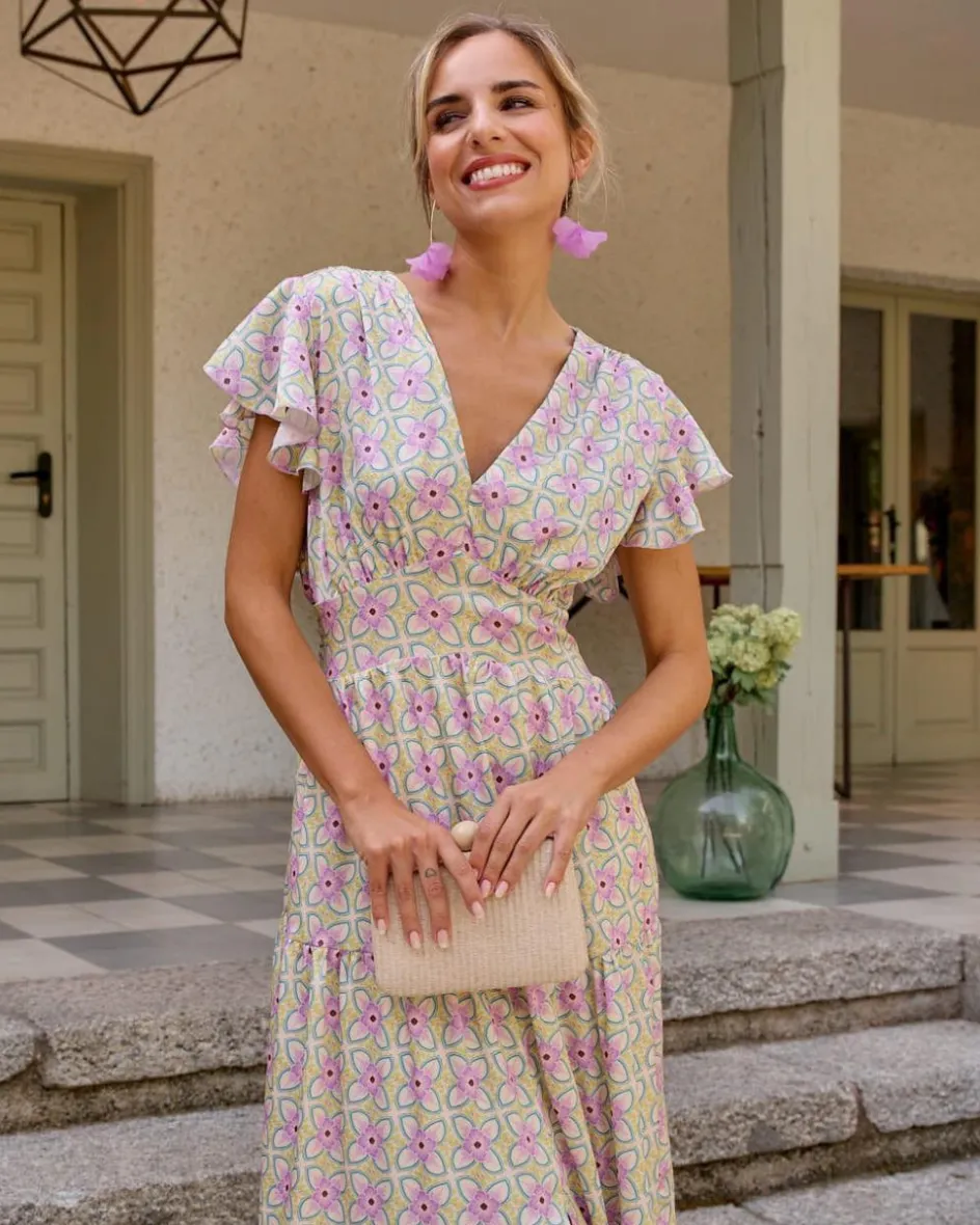 Vestido midi con estampado floral en color amarillo. Escote en pico y con la cintura ligeramente más ajustada con botones y con goma trasera para una mayor adaptación al cuerpo. Manga corta y amplia. Bajo del vestido con doble volante y abertura frontal para mayor vuelo y movimiento. Es un vestido ideal y muy favorecedor para los eventos de la temporada.