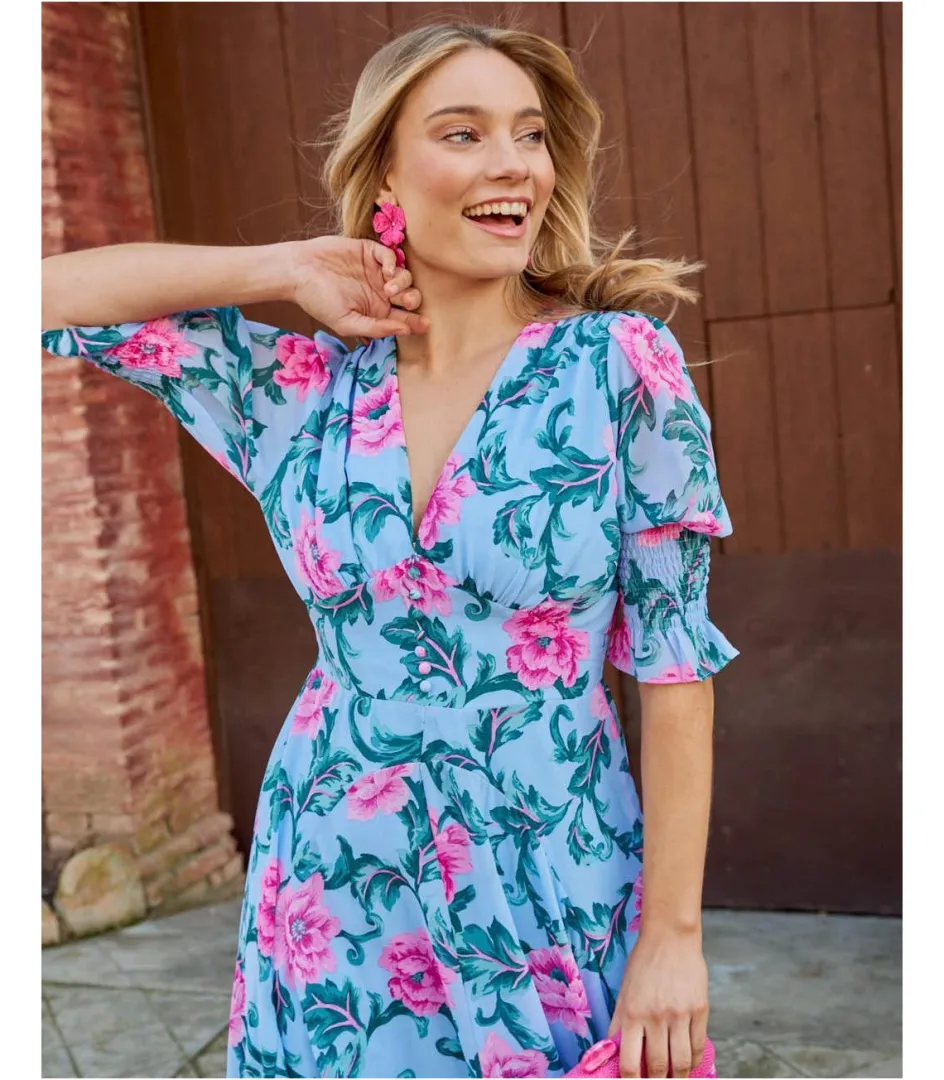 Vestido largo con estampado floral en azul celeste. Escote en pico. Corte bajo el pecho y a la cintura a modo de fajín con elástico a la espalda. Manga 3/4 ligeramente abullonada con detalle de ancho elástico al final. Falda con diseño recto y ligero vuelo. Incluye forro interior. Vestido estiloso y fabuloso para lucir en tus eventos favoritos. Vestido también ideal para el embarazo.