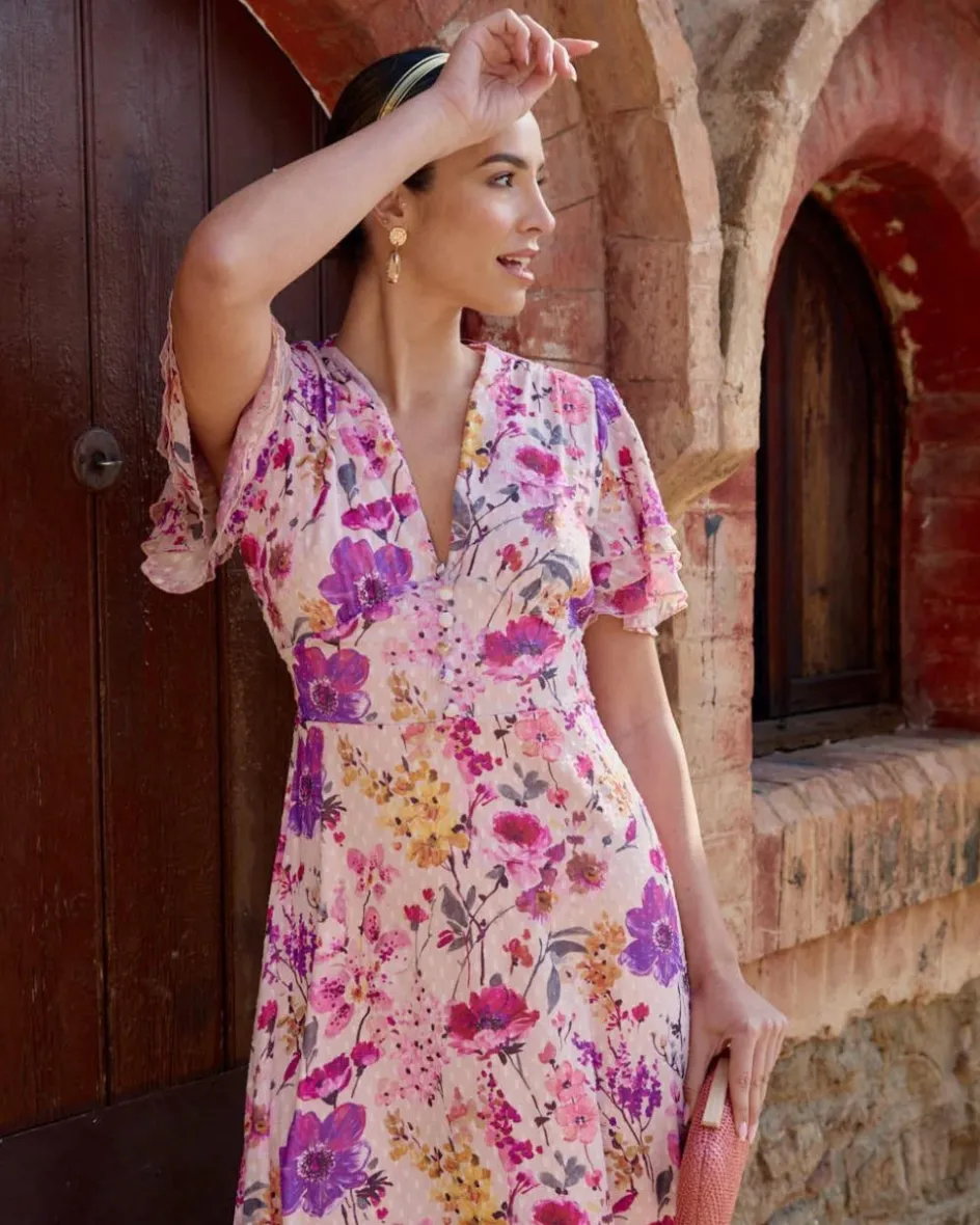 Vestido largo con estampado floral sobre un fondo rosa. Escote pico. Manga corta estilo murciélago con tres volantes. Corte en la cintura con franja elástica trasera. Botonadura decorativa forrada desde el escote hasta la cintura. Amplio volante en al bajo. Incluye forro interior. Vestido elegante.Vestido de invitada con un coste de devolución especial de 3,95€ que será descontado del importe total a devolver.