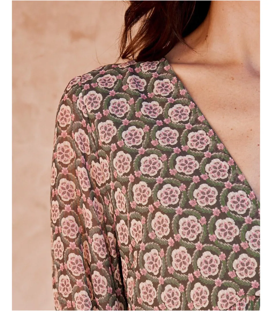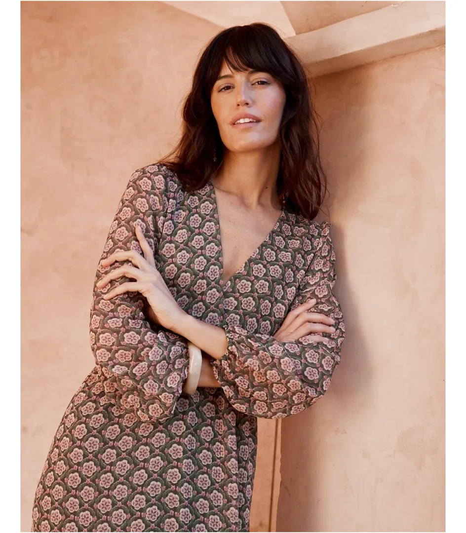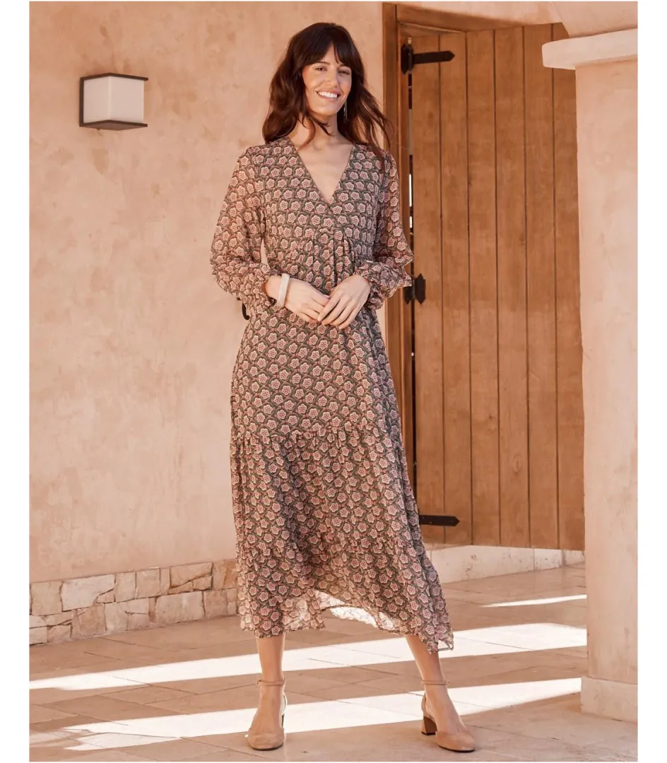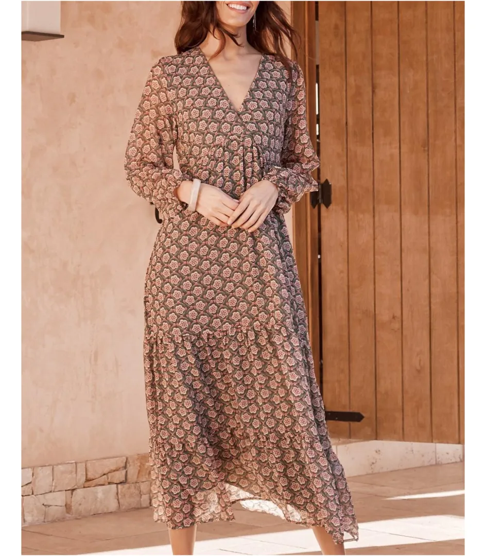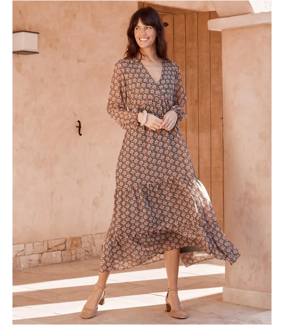Vestido largo con estampado floral en color verde esmeralda. Escote en pico y corte bajo el pecho. Modelo de manga larga terminado en elástico. Elástico en la cintura a la espalda para ajustar el vestido. Dispone de forro interior. Falda larga con vuelo y dos grandes volantes.