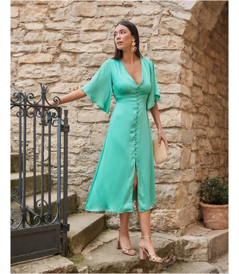 Vestido midi en color turquesa. Escote pico. Manga corta estilo murciélago. Corte en la cintura con franja elástica trasera. Botonadura forrada desde el escote hasta el bajo, con posibilidad de apertura. Apertura en el medio del bajo. Incluye forro interior. Vestido elegante.Made In Spain.Vestido de invitada con un coste de devolución especial de 3,95€ que será descontado del importe total a devolver.