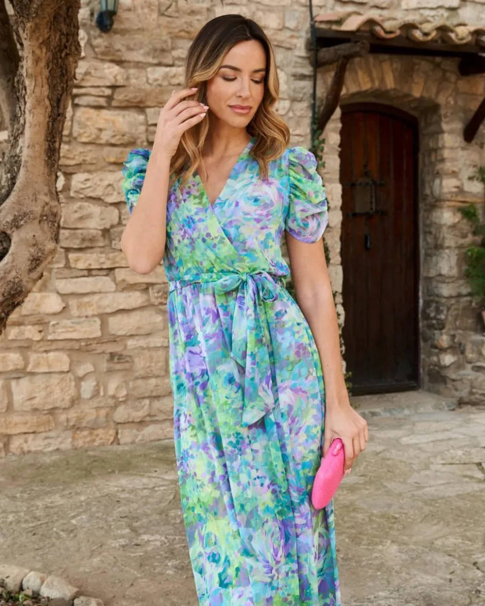 Vestido largo con estampado. Escote en pico cruzado. Corte en la cintura con detalle de cinta para atar a modo de cinturón en el mismo estampado del vestido. Manga corta ligeramente abullonada. Incluye forro interior. Vestido estiloso y fabuloso para lucir en tus eventos favoritos. Vestido también ideal para el embarazo y lactancia.Vestido de invitada con un coste de devolución especial de 3,95€ que será descontado del importe total a devolver.