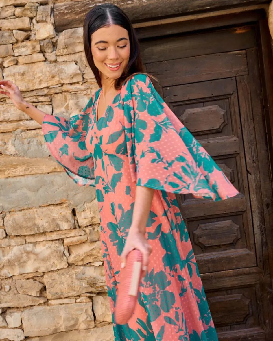 Vestido largo con estampado floral. Escote en pico. Corte bajo el pecho. Manga ancha, tres cuartos e irregular. Falda con ligero vuelo. Tela ligera y vaporosa. Un vestido con un diseño muy romántico para los eventos de esta temporada.Vestido de invitada con un coste de devolución especial de 3,95€ que será descontado del importe total a devolver.