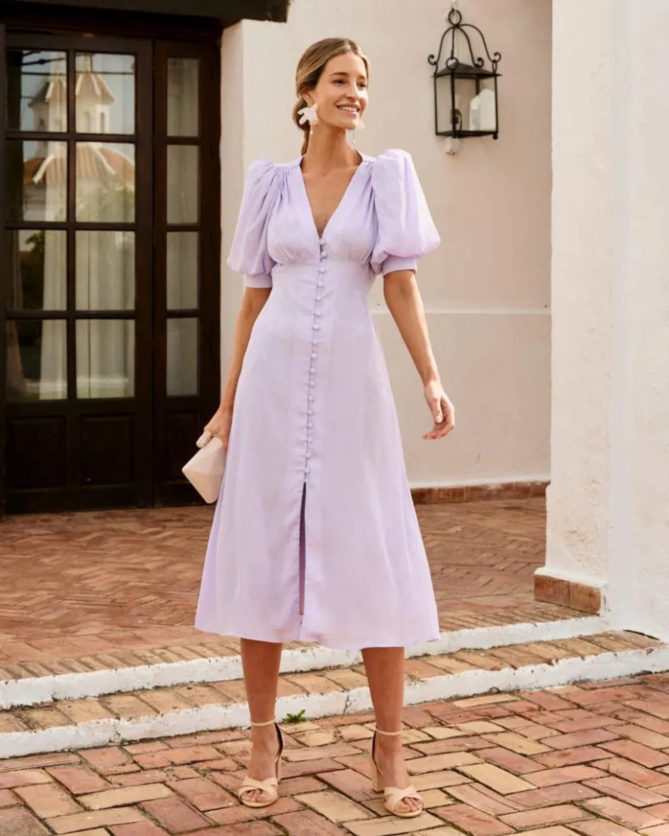 Vestido en color lila con estampado floral en el mismo tono prácticamente. Escote en pico y con la cintura ligeramente más ajustada con goma para una mayor adaptación al cuerpo. Manga corta abullonada. Falda del vestido midi, recta. Con hilera de botones forrados, desde el escote hasta la mitad el vestido aproximadamente. Un vestido ideal para las invitadas con un toque de color muy especial. Vestido también perfecto para la lactancia.