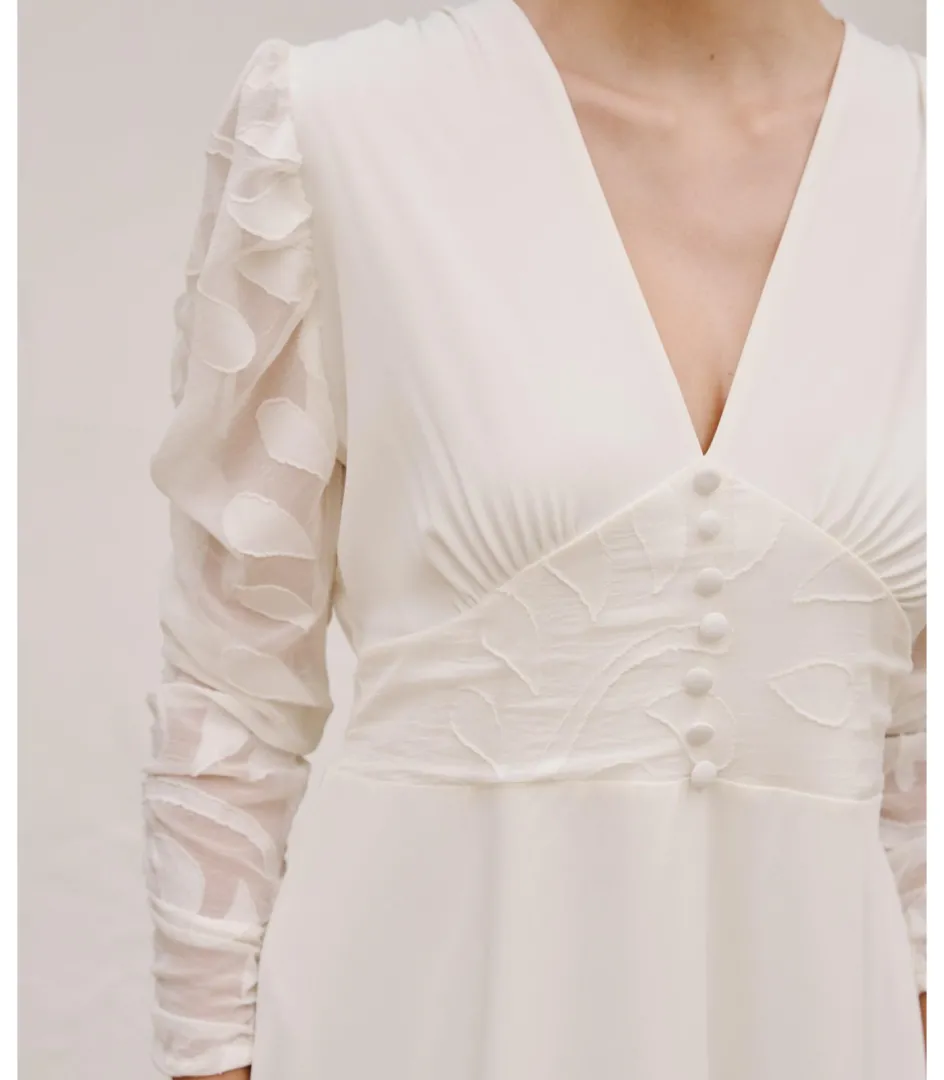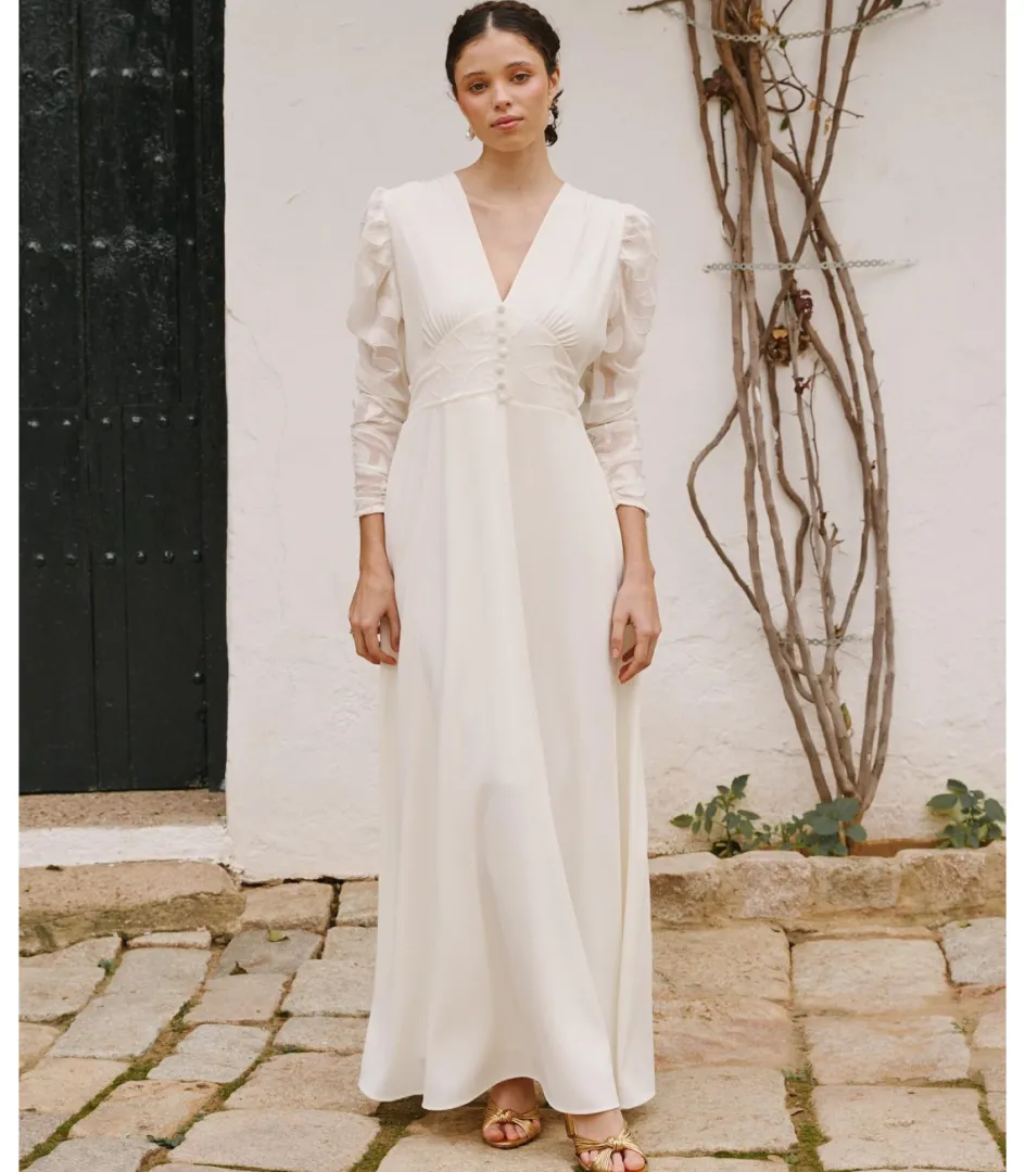 La felicidad en el amor y el significado de la palabra confianza dan lugar a este vestido de novia largo en color blanco con detalles bordados. Escote en pico con corte bajo el pecho. Manga larga bordada. Hilera de botones decorativos desde el escote hasta la cintura. Corte en la cintura del que nace una falda larga y recta ligeramente acampanada. El vestido de novia Lirio dispone de forro interior.