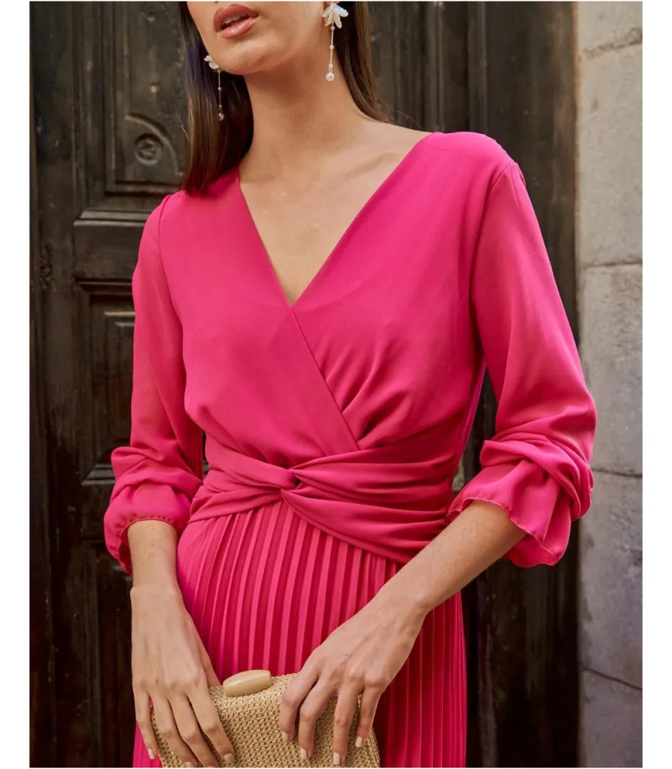 Vestido largo con plisados en color fucsia. Escote delantero en pico y cruzado. Corte en la cintura con goma elástica y diseño de nudo central. Manga tres cuartos con elástico. Falda larga de diseño recto con volumen. Incluye forro interior. Un vestido elegante para un evento especial. También ideal para embarazo y lactancia.