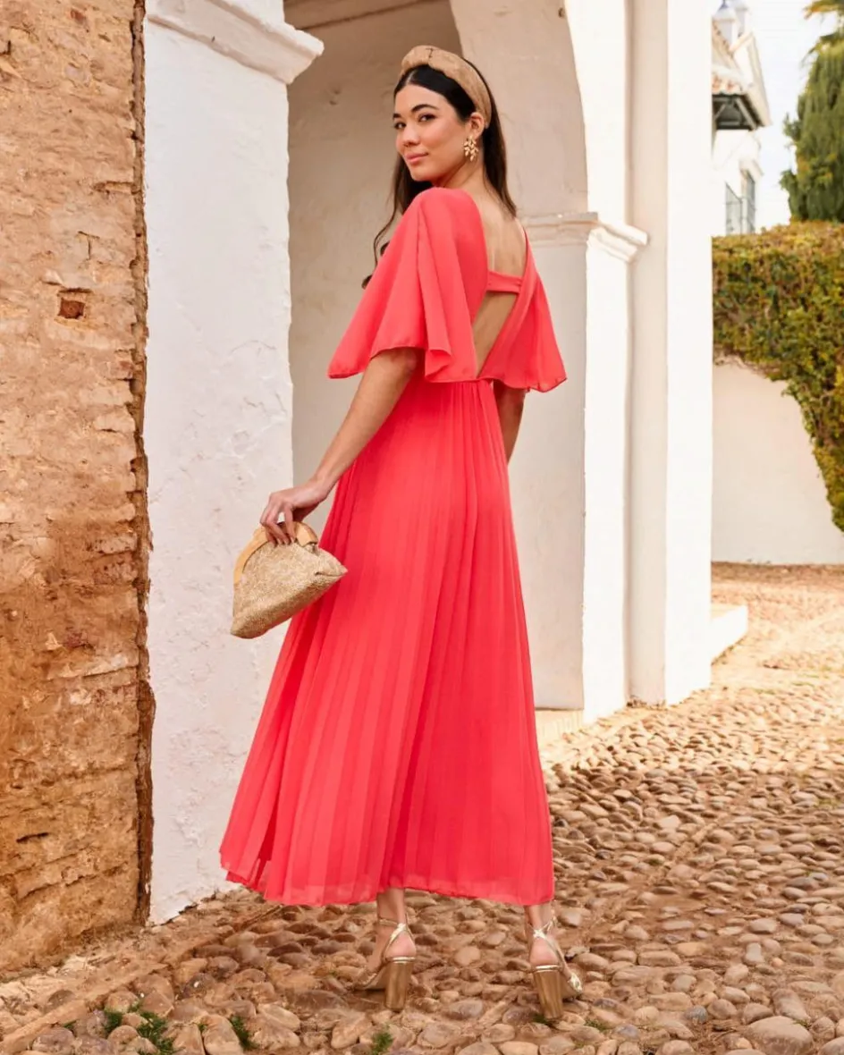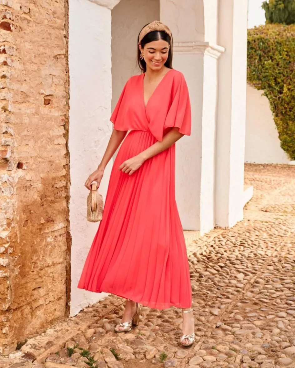 Vestido largo en color frambuesa. Escote en pico cruzado. Manga corta fluida. Cintura ligeramente más ajustada con goma para una mayor adaptación al cuerpo. Escote en la espalda con una cinta que atraviesa para mejorar la comodidad del vestido. Falda del vestido plisada, con bajo fluido. Un vestido ideal para las invitadas con un toque de color muy especial. Vestido también perfecto para el embarazo y la lactancia.